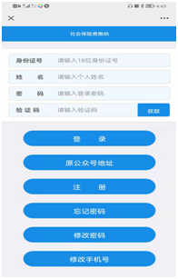 【第二步】登录系统。录入参保人员信息,包括身份证号、姓名、密码、点击[获取]向输入手机发送验证码,输入收到的验证码。点击[登录]按钮,校验缴费人登记信息,如果缴费人登记信息存在,则允许登录,进入社保费业务办理主页面。