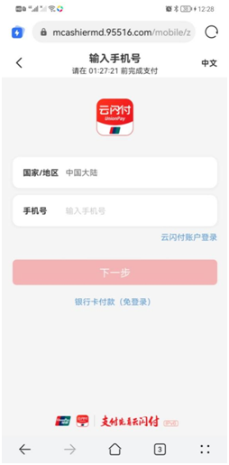 注:根据选择的支付方式不同会调用不同的支付界面,当前以“云闪付”支付界面为例。